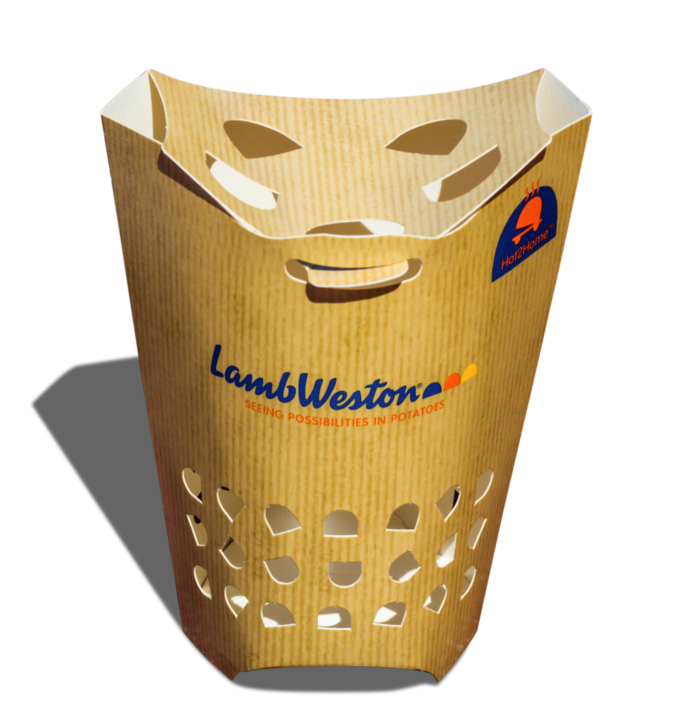 The new Hot2Home™ Fry Cup is made of folding carton board. The Hot2Home™ pack has a standing, tapered shape with a curved bottom that enables the fries to have an open stack in the pack to allow air to flow through the stack of fries. A pattern with holes has been made in the sides and the lid of the pack to provide optimal ventilation. Because of the specific design of the holes in the sides and the lid, the cup works like a chimney that helps to remove the moisture released by the fries in such a way that the fries stay crispy and warm for 20 minutes. The shape of the holes has been derived from the logo of LambWeston and creates the link between the pack and the owner of the design. The graphical design is quite neutral, but can be changed according to the specific wishes of the customers of LambWeston. The functioning and design have been validated through consumer research that showed that consumers associated the shape of the Hot2Home cup with fries.